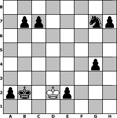 Partie-Notation im PGN-Format [Event "Aljechin - zum F"] [Site "www.mySchach.de"] [Date "2008.10.11"] [Round "1"] [White "babikar"] [Black "reisinger"] [ECO "B02"] [WhitemyELO "1493"] [BlackmyELO "1452"] [Result "0-1"] [TimeControl "10/1728000"] [WhiteDays "90"] [BlackDays "99"] [MySchachNr "48745"] 1. e4 Nf6 2. d3 e5 3. Nf3 Nc6 4. d4 d6 5. dxe5 Nxe4 6. Bd3 Bf5 7. O-O dxe5 8. Nc3 Nxc3 9. Qd2 Bxd3 10. Qxd3 Qxd3 11. cxd3 Ne2+ 12. Kh1 Nxc1 13. Raxc1 Bd6 14. Rfe1 O-O-O 15. Ng5 Rdf8 16. Ne4 Rd8 17. a3 f5 18. Nxd6+ Rxd6 19. g3 Rxd3 20. Rcd1 Rhd8 21. Rxd3 Rxd3 22. f4 e4 23. Rc1 Nd4 24. Re1 e3 25. h4 e2 26. Kg2 Rd1 27. Kf2 Rxe1 28. Kxe1 Kd7 29. Kd2 Kd6 30. a4 a5 31. Ke1 Kc5 32. Kf2 Kb4 33. Ke1 Kxa4 34. h5 Kb3 35. Kd2 Kxb2 36. g4 fxg4 37. Ke1 a4 38. Kd2 a3 39. f5 a2 40. h6 Nxf5 41. hxg7 Nxg7 0-1 Stellungs-Notation im FEN-Format 8/1pp3np/8/8/6p1/8/pk1Kp3/8 - - - 0 42 Geschlagene Figuren Weiss: Geschlagene Figuren Schwarz: Klicken Sie auf eine geschlagene Figur um den gewünschten Zug darzustellen!