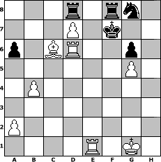 Partie-Notation im PGN-Format [Event "guinan"] [Site "www.mySchach.de"] [Date "2010.05.17"] [Round "1"] [White "Erich"] [Black "Scully"] [ECO "B28"] [WhitemyELO "1837"] [BlackmyELO "1545"] [Result "1-0"] [TimeControl "10/2592000"] [WhiteDays "120"] [BlackDays "088"] [MySchachNr "65591"] 1. e4 c5 2. Nf3 a6 3. c3 d5 4. exd5 Qxd5 5. d4 Bg4 6. Be2 cxd4 7. cxd4 e6 8. Nc3 Bb4 9. O-O Qa5 10. h3 Bh5 11. d5 Bxc3 12. dxe6 Bf6 13. Ng5 Bxg5 14. Bxh5 g6 15. Qb3 Nf6 16. Qxb7 O-O 17. Bxg5 Qxg5 18. Bf3 Nbd7 19. exd7 Rad8 20. Rad1 Qe5 21. Rfe1 Qc5 22. b4 Qc4 23. Qc6 Qxc6 24. Bxc6 Kg7 25. g4 h6 26. f4 Ng8 27. g5 hxg5 28. fxg5 f6 29. h4 Kf7 30. Rd6 fxg5 31. hxg5 1-0 Stellungs-Notation im FEN-Format 3r1rn1/3P1k2/p1BR2p1/6P1/1P6/8/P7/4R1K1 - - - 0 31 Geschlagene Figuren Weiss: ![]() ![]() ![]() ![]() ![]() ![]() ![]() ![]() ![]() ![]() ![]() ![]() ![]() ![]() ![]() Geschlagene Figuren Schwarz: ![]() ![]() ![]() ![]() ![]() ![]() ![]() ![]() ![]() ![]() ![]() ![]() ![]() ![]() ![]() Klicken Sie auf eine geschlagene Figur um den gewünschten Zug darzustellen!