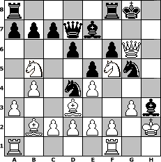Partie-Notation im PGN-Format [Event "Es weihnachtet sehr"] [Site "www.mySchach.de"] [Date "2021.12.20"] [Round "1"] [White "MiFie"] [Black "Haneken"] [ECO "C41"] [WhitemyELO "1085"] [BlackmyELO "1077"] [Result "1-0"] [TimeControl "10/864000"] [WhiteDays "10"] [BlackDays "10"] [MySchachNr "123980"] 1. e4 e5 2. Nf3 d6 3. Bd3 Be7 4. O-O Nf6 5. h3 O-O 6. Nc3 Nc6 7. a3 Be6 8. b4 h6 9. Bb2 Nh5 10. Nh4 Nf4 11. g3 Nxh3+ 12. Kg2 g5 13. Nf5 g4 14. Nxh6+ Kh7 15. Nxg4 Ng5 16. Nb5 f6 17. Ne3 Bh3+ 18. Kh2 Qd7 19. Nf5 Nd4 20. Qh5+ Kg8 21. Qg6+ 1-0 Stellungs-Notation im FEN-Format r4rk1/pppqb3/3p1pQ1/1N2pNn1/1P1nP3/P2B2Pb/1BPPPP1K/R4R2 - - - 9 21 Geschlagene Figuren Weiss: Geschlagene Figuren Schwarz: Klicken Sie auf eine geschlagene Figur um den gewünschten Zug darzustellen!