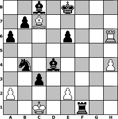Partie-Notation im PGN-Format [Event "Dann mal los"] [Site "www.mySchach.de"] [Date "2006.09.24"] [Round "1"] [White "Mirikado23"] [Black "Chelly"] [ECO "A00"] [WhitemyELO "1500"] [BlackmyELO "1747"] [Result "0-1"] [TimeControl "10/864000"] [WhiteDays "22"] [BlackDays "32"] [MySchachNr "28880"] 1. Nc3 e6 2. Nh3 Bb4 3. Ne4 d5 4. Neg5 h6 5. Nf3 g5 6. c3 Bd6 7. Nd4 g4 8. Nf4 Bxf4 9. Qa4+ Qd7 10. Nb5 Bg5 11. b3 a6 12. Nxc7+ Kd8 13. Nxa8 Qxa4 14. bxa4 Nd7 15. Rb1 Ne7 16. h4 Bf4 17. a5 Nc6 18. c4 dxc4 19. f3 Bg3+ 20. Kd1 gxf3 21. Nb6 fxg2 22. Bxg2 Nxa5 23. Bb2 Rg8 24. d3 Nxb6 25. Bf6+ Kc7 26. Bc3 Bf2 27. Be5+ Kd7 28. Bh3 Nd5 29. Rf1 Ne3+ 30. Kd2 Nxf1+ 31. Rxf1 Nc6 32. d4 Bxd4 33. Rxf7+ Kd8 34. Bc7+ Ke8 35. Rh7 Nb4 36. Rxh6 c3+ 37. Kc1 Rg1+ 38. Bf1 Rxf1# 0-1 Stellungs-Notation im FEN-Format 2b1k3/1pB5/p3p2R/8/1n1b3P/2p5/P3P3/2K2r2 - - - 0 39 Geschlagene Figuren Weiss: Geschlagene Figuren Schwarz: Klicken Sie auf eine geschlagene Figur um den gewünschten Zug darzustellen!