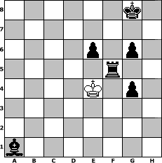 Partie-Notation im PGN-Format [Event "Sweety Tunier"] [Site "www.mySchach.de"] [Date "2006.02.28"] [Round "1"] [White "icke"] [Black "Robur"] [ECO "D02"] [WhitemyELO "1355"] [BlackmyELO "1721"] [Result "0-1"] [TimeControl "10/2592000"] [WhiteDays "143"] [BlackDays "132"] [MySchachNr "22983"] 1. d4 d5 2. Nf3 e6 3. e3 Nf6 4. Bd2 Nbd7 5. Nc3 Be7 6. Ng5 O-O 7. Bd3 h6 8. Nf3 c5 9. dxc5 Nxc5 10. Ne5 Nxd3+ 11. Nxd3 Bd7 12. Ne5 Bd6 13. Ng4 b5 14. Nxf6+ Qxf6 15. Qe2 b4 16. Nb5 Bxb5 17. Qxb5 Qxb2 18. O-O Qxc2 19. Bxb4 Rfb8 20. Rac1 Rxb5 21. Rxc2 Rxb4 22. Rc6 Rb6 23. Rc3 Rb2 24. Rfc1 Rab8 25. g3 Rxa2 26. Rc6 Bf8 27. Rc7 Rbb2 28. Rf1 a5 29. Rcc1 a4 30. h4 a3 31. Rb1 Rxb1 32. Rxb1 Rb2 33. Ra1 a2 34. Kg2 Bc5 35. Kf3 d4 36. exd4 Bxd4 37. Rd1 Rxf2+ 38. Ke4 a1=Q 39. Rxa1 Bxa1 40. Ke3 Rf5 41. Ke4 g5 42. hxg5 h5 43. g4 hxg4 44. g6 fxg6 0-1 Stellungs-Notation im FEN-Format 6k1/8/4p1p1/5r2/4K1p1/8/8/b7 - - - 0 45 Geschlagene Figuren Weiss: Geschlagene Figuren Schwarz: Klicken Sie auf eine geschlagene Figur um den gewünschten Zug darzustellen!