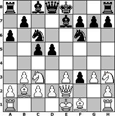 Partie-Notation im PGN-Format [Event "Master-Blitz"] [Site "www.mySchach.de"] [Date "2009.03.06"] [Round "1"] [White "rikilatic"] [Black "bane"] [ECO "A01"] [WhitemyELO "1389"] [BlackmyELO "1804"] [Result "0-1"] [TimeControl "10/86400"] [WhiteDays "00"] [BlackDays "01"] [MySchachNr "53318"] 1. b3 d5 2. Bb2 c5 3. e3 a6 4. Qf3 Nc6 5. Nh3 e5 6. Nc3 Nf6 7. Qe2 Be7 8. g3 e4 9. f3 exf3 0-1 Stellungs-Notation im FEN-Format r1bqk2r/1p2bppp/p1n2n2/2pp4/8/1PN1PpPN/PBPPQ2P/R3KB1R - KQkq - 0 10 Geschlagene Figuren Weiss: Geschlagene Figuren Schwarz: Klicken Sie auf eine geschlagene Figur um den gewünschten Zug darzustellen!
