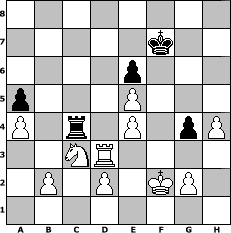 Partie-Notation im PGN-Format [Event "Albspiele 5"] [Site "www.mySchach.de"] [Date "2010.07.03"] [Round "1"] [White "Haneken"] [Black "Knight"] [ECO "E76"] [WhitemyELO "1582"] [BlackmyELO "1158"] [Result "1-0"] [TimeControl "10/1728000"] [WhiteDays "16"] [BlackDays "20"] [MySchachNr "66772"] 1. d4 Nf6 2. c4 g6 3. Nc3 Bg7 4. e4 d6 5. f4 O-O 6. Nf3 c5 7. d5 Bg4 8. Bd3 Na6 9. Be3 Nb4 10. Be2 Qa5 11. O-O e6 12. dxe6 fxe6 13. Qxd6 Nc2 14. Qxc5 Qxc5 15. Bxc5 Rfc8 16. Rac1 Rxc5 17. Rxc2 a5 18. Ne5 Bxe2 19. Rxe2 Rac8 20. Rd1 Ne8 21. Rd7 Bxe5 22. fxe5 Rxc4 23. Rxb7 Ng7 24. Rd7 Nh5 25. Rf2 Rf8 26. Rxf8+ Kxf8 27. Rxh7 Nf4 28. Rd7 g5 29. Kf2 g4 30. a4 Nd3+ 31. Rxd3 Kf7 32. h4 1-0 Stellungs-Notation im FEN-Format 8/5k2/4p3/p3P3/P1r1P1pP/2NR4/1P1P1KP1/8 - - - 0 32 Geschlagene Figuren Weiss: Geschlagene Figuren Schwarz: Klicken Sie auf eine geschlagene Figur um den gewünschten Zug darzustellen!