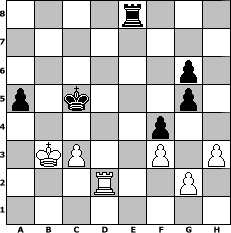 Partie-Notation im PGN-Format [Event "MNX1"] [Site "www.mySchach.de"] [Date "2015.03.13"] [Round "1"] [White "kalle"] [Black "martinus"] [ECO "B32"] [WhitemyELO "1603"] [BlackmyELO "1742"] [Result "1/2-1/2"] [TimeControl "10/2592000"] [WhiteDays "30"] [BlackDays "30"] [MySchachNr "98505"] 1. e4 c5 2. Nf3 Nc6 3. d4 cxd4 4. Nxd4 e5 5. Nb5 d6 6. Bc4 a6 7. N5c3 Nf6 8. a4 Be6 9. Ba2 Bxa2 10. Rxa2 Nb4 11. Ra3 d5 12. exd5 Nbxd5 13. Nxd5 Qxd5 14. Qxd5 Nxd5 15. Rb3 Nb4 16. c3 Nd3+ 17. Ke2 O-O-O 18. Be3 Nc5 19. Rb4 Nd3 20. Rb6 Nxb2 21. Rxb2 f5 22. Rd2 Bd6 23. Bg5 Rd7 24. Rhd1 Kc7 25. Na3 h6 26. Nc4 hxg5 27. Nxd6 Rdd8 28. h3 g6 29. Nc4 Rxd2+ 30. Rxd2 Rh4 31. Nxe5 Re4+ 32. Kd3 Rxe5 33. Kc4 Kc6 34. f3 Rc5+ 35. Kb4 a5+ 36. Kb3 b5 37. Re2 Kd5 38. Rd2+ Kc6 39. axb5+ Rxb5+ 40. Ka4 Re5 41. Rb2 f4 42. Rd2 Kc5 43. Kb3 Re8 1/2-1/2 Stellungs-Notation im FEN-Format 4r3/8/6p1/p1k3p1/5p2/1KP2P1P/3R2P1/8 - - - 4 44 Geschlagene Figuren Weiss: Geschlagene Figuren Schwarz: Klicken Sie auf eine geschlagene Figur um den gewünschten Zug darzustellen!