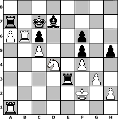 Partie-Notation im PGN-Format [Event "F"] [Site "www.mySchach.de"] [Date "2012.10.18"] [Round "1"] [White "Schefsche"] [Black "lotchi"] [ECO "C21"] [WhitemyELO "1303"] [BlackmyELO "1379"] [Result "1-0"] [TimeControl "10/864000"] [WhiteDays "10"] [BlackDays "00"] [MySchachNr "84551"] 1. e4 e5 2. d4 exd4 3. Nf3 Nc6 4. Bb5 a6 5. Bxc6 bxc6 6. Qxd4 c5 7. Qd5 c6 8. Qe5+ Qe7 9. Qxe7+ Bxe7 10. c4 d6 11. Nc3 Be6 12. b3 h6 13. O-O f5 14. e5 dxe5 15. Nxe5 Bd7 16. Na4 Bf6 17. Bb2 Bxe5 18. Bxe5 Rh7 19. Rfe1 O-O-O 20. Nxc5 a5 21. a4 h5 22. Bc3 Nf6 23. Bxf6 gxf6 24. f4 Rg7 25. b4 axb4 26. a5 Kc7 27. Reb1 Bc8 28. Rxb4 Rd2 29. g3 Kd6 30. Nb3 Re2 31. a6 Ra7 32. c5+ Kc7 33. Rb6 Re3 34. Nd4 Bd7 35. Kf2 1-0 Stellungs-Notation im FEN-Format 8/r1kb4/PRp2p2/2P2p1p/3N1P2/4r1P1/5K1P/R7 - - - 6 35 Geschlagene Figuren Weiss: Geschlagene Figuren Schwarz: Klicken Sie auf eine geschlagene Figur um den gewünschten Zug darzustellen!