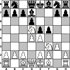 Partie-Notation im PGN-Format [Event "Trainingslager II"] [Site "www.mySchach.de"] [Date "2011.05.24"] [Round "1"] [White "Helmut48"] [Black "reisender"] [ECO "C25"] [WhitemyELO "1880"] [BlackmyELO "1322"] [Result "0-1"] [TimeControl "10/1728000"] [WhiteDays "00"] [BlackDays "20"] [MySchachNr "74112"] 1. e4 e5 2. Nc3 d6 3. g3 f5 4. d4 Qf6 5. Nf3 Bd7 6. Nd5 Qd8 0-1 Stellungs-Notation im FEN-Format rn1qkbnr/pppb2pp/3p4/3Npp2/3PP3/5NP1/PPP1PP1P/R1BQKB1R - KQkq - 5 7 Geschlagene Figuren Weiss: Geschlagene Figuren Schwarz: Klicken Sie auf eine geschlagene Figur um den gewünschten Zug darzustellen!