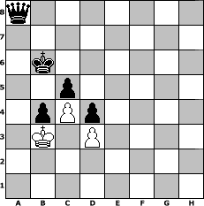 Partie-Notation im PGN-Format [Event "unter uns Nr. 53 (Sommeranfang)"] [Site "www.mySchach.de"] [Date "2022.06.22"] [Round "1"] [White "Andreas1954"] [Black "lotchi"] [ECO "C20"] [WhitemyELO "1370"] [BlackmyELO "1311"] [Result "0-1"] [TimeControl "10/864000"] [WhiteDays "60"] [BlackDays "60"] [MySchachNr "126124"] 1. e4 e5 2. d3 d5 3. Nf3 Nc6 4. exd5 Qxd5 5. c4 Qd7 6. Qe2 Bc5 7. a3 f6 8. b4 Be7 9. b5 Nd4 10. Bb2 b6 11. Nxd4 exd4 12. Nd2 c5 13. a4 Bb7 14. h4 O-O-O 15. g3 Bxh1 16. f3 h5 17. Qh2 Bxf3 18. Nxf3 g5 19. hxg5 fxg5 20. Ne5 Qe6 21. Qe2 g4 22. Qe4 Kb8 23. Nc6+ Qxc6 24. bxc6 Bd6 25. Ke2 Nh6 26. a5 Rde8 27. Qxe8+ Rxe8+ 28. Kd2 Bxg3 29. axb6 axb6 30. Ra6 Bc7 31. Be2 Nf5 32. Bc1 Ng3 33. Bd1 h4 34. Bxg4 Rh8 35. Kc2 h3 36. Bf4 Ne2 37. Bxe2 Bxf4 38. Ra1 h2 39. Bf3 Rh3 40. Rf1 Rxf3 41. Rxf3 h1=Q 42. Rxf4 Qxc6 43. Rf8+ Ka7 44. Rf7+ Ka6 45. Rf8 b5 46. Kb3 Ka5 47. Rf7 b4 48. Ra7+ Kb6 49. Ra4 Qf3 50. Ra8 Qxa8 0-1 Stellungs-Notation im FEN-Format q7/8/1k6/2p5/1pPp4/1K1P4/8/8 - - - 0 51 Geschlagene Figuren Weiss: Geschlagene Figuren Schwarz: Klicken Sie auf eine geschlagene Figur um den gewünschten Zug darzustellen!