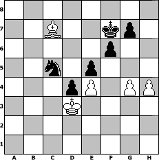 Partie-Notation im PGN-Format [Event "Herbstturnier 2022"] [Site "www.mySchach.de"] [Date "2022.09.26"] [Round "1"] [White "Mynona"] [Black "muellerh"] [ECO "D00"] [WhitemyELO "1445"] [BlackmyELO "1540"] [Result "0-1"] [TimeControl "10/1728000"] [WhiteDays "80"] [BlackDays "72"] [MySchachNr "127249"] 1. d4 d5 2. Bf4 Nf6 3. e3 Nc6 4. a3 Bf5 5. c4 e6 6. c5 b6 7. b4 a5 8. Nc3 axb4 9. axb4 Rxa1 10. Qxa1 Nxb4 11. Kd2 bxc5 12. Nf3 c4 13. Be2 Be7 14. Qa7 O-O 15. Ra1 c5 16. dxc5 Ne4+ 17. Nxe4 Bxe4 18. Qb6 Nc2 19. Qxd8 Rxd8 20. Ra5 Rc8 21. Ne5 Bxc5 22. f3 Bd3 23. Bxd3 cxd3 24. Nxd3 Bb4+ 25. Nxb4 Nxb4 26. Rb5 Na2 27. Ra5 Nc1 28. Ra7 Nb3+ 29. Kd3 f6 30. Bd6 e5 31. Rc7 Rxc7 32. Bxc7 Kf7 33. e4 d4 34. h4 h5 35. g4 hxg4 36. fxg4 Nc5+ 0-1 Stellungs-Notation im FEN-Format 8/2B2kp1/5p2/2n1p3/3pP1PP/3K4/8/8 - - - 1 37 Geschlagene Figuren Weiss: Geschlagene Figuren Schwarz: Klicken Sie auf eine geschlagene Figur um den gewünschten Zug darzustellen!