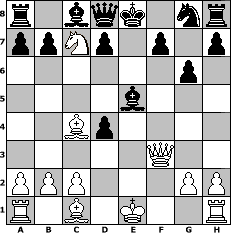 Partie-Notation im PGN-Format [Event "Sizilianisch: Grand Prix Angriff"] [Site "www.mySchach.de"] [Date "2011.09.05"] [Round "1"] [White "HenrySchinasky"] [Black "muellerh"] [ECO "B23"] [WhitemyELO "2102"] [BlackmyELO "1463"] [Result "1-0"] [TimeControl "10/864000"] [WhiteDays "17"] [BlackDays "00"] [MySchachNr "76102"] 1. e4 c5 2. Nc3 Nc6 3. f4 e5 4. fxe5 Nxe5 5. Nf3 Nxf3+ 6. Qxf3 Nf6 7. e5 Qe7 8. Qe2 Ng8 9. Nd5 Qd8 10. Qh5 g6 11. Qf3 Bg7 12. d4 cxd4 13. Bc4 Bxe5 14. Nc7+ 1-0 Stellungs-Notation im FEN-Format r1bqk1nr/ppNp1p1p/6p1/4b3/2Bp4/5Q2/PPP3PP/R1B1K2R - KQkq - 1 14 Geschlagene Figuren Weiss: Geschlagene Figuren Schwarz: Klicken Sie auf eine geschlagene Figur um den gewünschten Zug darzustellen!