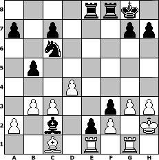 Partie-Notation im PGN-Format [Event "Neujahrstunier"] [Site "www.mySchach.de"] [Date "2010.12.23"] [Round "1"] [White "Joschi"] [Black "pepo47"] [ECO "C42"] [WhitemyELO "1527"] [BlackmyELO "1811"] [Result "0-1"] [TimeControl "10/2592000"] [WhiteDays "82"] [BlackDays "88"] [MySchachNr "70743"] 1. e4 e5 2. Nf3 Nf6 3. Nxe5 d6 4. Nf3 Nxe4 5. d4 d5 6. h3 Bb4+ 7. c3 Bd6 8. Bd3 O-O 9. O-O Bf5 10. Be3 Qf6 11. Qc2 Nc6 12. Nbd2 Rae8 13. Rae1 Bg6 14. Bxe4 dxe4 15. Nh2 Qe6 16. b3 f5 17. Nc4 Bxh2+ 18. Kxh2 f4 19. Bc1 b5 20. Nb2 f3 21. g3 e3 22. Nd3 e2 23. Rg1 Qe4 24. Nb4 Qxc2 25. Nxc2 Bxc2 0-1 Stellungs-Notation im FEN-Format 4rrk1/p1p3pp/2n5/1p6/3P4/1PP2pPP/P1b1pP1K/2B1R1R1 - - - 0 26 Geschlagene Figuren Weiss: Geschlagene Figuren Schwarz: Klicken Sie auf eine geschlagene Figur um den gewünschten Zug darzustellen!