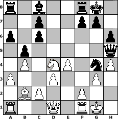 Partie-Notation im PGN-Format [Event "Eine Chance f"] [Site "www.mySchach.de"] [Date "2008.08.01"] [Round "1"] [White "bluescreenlover"] [Black "Fussel"] [ECO "C50"] [WhitemyELO "1226"] [BlackmyELO "1324"] [Result "1-0"] [TimeControl "10/1728000"] [WhiteDays "17"] [BlackDays "00"] [MySchachNr "46738"] 1. e4 e5 2. Nf3 Nc6 3. Bc4 h6 4. Nc3 Nf6 5. d3 Bc5 6. O-O O-O 7. a3 a6 8. b4 Bd4 9. Bb2 b5 10. Bd5 Ng4 11. Bxc6 dxc6 12. Nxd4 exd4 13. Ne2 Qd6 14. g3 Qg6 15. Nxd4 Qh5 16. h4 1-0 Stellungs-Notation im FEN-Format r1b2rk1/2p2pp1/p1p4p/1p5q/1P1NP1nP/P2P2P1/1BP2P2/R2Q1RK1 - - - 0 16 Geschlagene Figuren Weiss: Geschlagene Figuren Schwarz: Klicken Sie auf eine geschlagene Figur um den gewünschten Zug darzustellen!