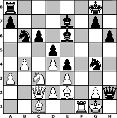 | Partie-Notation im PGN-Format [Event "Oktober Schach"] [Site "www.mySchach.de"] [Date "2008.10.04"] [Round "1"] [White "Ostseeboy"] [Black "thw"] [ECO "A40"] [WhitemyELO "1302"] [BlackmyELO "1486"] [Result "0-1"] [TimeControl "10/864000"] [WhiteDays "10"] [BlackDays "10"] [MySchachNr "48605"] 1. d4 e6 2. c4 d5 3. c5 e5 4. e3 e4 5. Bb5+ c6 6. Be2 f5 7. Nh3 Nf6 8. O-O h6 9. Nc3 Be7 10. b4 O-O 11. Bb2 Nbd7 12. f3 b6 13. fxe4 fxe4 14. cxb6 Nxb6 15. a3 Bxh3 16. Rf2 Be6 17. Qc2 Ng4 18. Rxf8+ Qxf8 19. Rf1 Qb8 20. Bc1 Qxh2# 0-1 Stellungs-Notation im FEN-Format r5k1/p3b1p1/1np1b2p/3p4/1P1Pp1n1/P1N1P3/2QPB1Pq/2B2RK1 - - - 0 21 Geschlagene Figuren Weiss:                              Geschlagene Figuren Schwarz:                               Klicken Sie auf eine geschlagene Figur um den gewünschten Zug darzustellen!