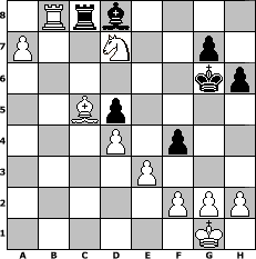 Partie-Notation im PGN-Format [Event "?"] [Site "www.mySchach.de"] [Date "2025.10.13"] [Round "?"] [White "Seneca"] [Black "Winston"] [ECO "D00"] [WhitemyELO "1515"] [BlackmyELO "1531"] [Result "1-0"] [TimeControl "10/2592000"] [WhiteDays "30"] [BlackDays "30"] [MySchachNr "133735"] 1. d4 d5 2. e3 a6 3. Nf3 Nc6 4. Be2 h6 5. O-O Nf6 6. Nbd2 Bf5 7. a3 e6 8. c4 b6 9. b4 dxc4 10. Bxc4 b5 11. Bb3 a5 12. bxa5 Nxa5 13. Bc2 Bxc2 14. Qxc2 Nb7 15. Qc6+ Nd7 16. Qxb7 c6 17. Qxc6 b4 18. Ne5 Ra7 19. a4 Be7 20. Nb3 O-O 21. Nxd7 Rxd7 22. Bb2 Rc7 23. Qb5 Bf6 24. Qxb4 Qd5 25. Nc5 Be7 26. Rac1 Ra8 27. Qa3 Rca7 28. Qb4 Rb7 29. Qc3 Rc7 30. a5 Rac8 31. Ba3 f5 32. Qc4 Kf7 33. Qxd5 exd5 34. Rb1 Ra7 35. Rb5 Bd8 36. a6 Rca8 37. Rb7+ Kg6 38. Rxa7 Rxa7 39. Rb1 Bf6 40. Rb7 Ra8 41. a7 f4 42. Nd7 Bd8 43. Bc5 Rc8 44. Rb8 1-0 Stellungs-Notation im FEN-Format 1Rrb4/P2N2p1/6kp/2Bp4/3P1p2/4P3/5PPP/6K1 - - - 5 44 Geschlagene Figuren Weiss: Geschlagene Figuren Schwarz: Klicken Sie auf eine geschlagene Figur um den gewünschten Zug darzustellen!