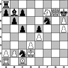 Partie-Notation im PGN-Format [Event "Aljechin - zum F"] [Site "www.mySchach.de"] [Date "2008.10.11"] [Round "1"] [White "Chaos"] [Black "babikar"] [ECO "B02"] [WhitemyELO "1693"] [BlackmyELO "1493"] [Result "1-0"] [TimeControl "10/1728000"] [WhiteDays "56"] [BlackDays "51"] [MySchachNr "48777"] 1. e4 Nf6 2. d3 Nc6 3. f4 e6 4. Nf3 Bc5 5. Nbd2 O-O 6. Nb3 Ng4 7. Nxc5 e5 8. Be2 d6 9. f5 dxc5 10. h3 Nf6 11. g4 h6 12. Rg1 Re8 13. h4 b6 14. g5 Nd7 15. gxh6 Bb7 16. Rxg7+ Kh8 17. Ng5 Re7 18. Rxf7 Qg8 19. Bh5 Rxf7 20. Nxf7+ Kh7 21. Bg6+ Qxg6 22. fxg6+ Kxg6 23. Qf3 Nd4 24. h5+ Kh7 25. Qg4 Nxc2+ 26. Kd2 Nf6 27. Qg7# 1-0 Stellungs-Notation im FEN-Format r7/pbp2NQk/1p3n1P/2p1p2P/4P3/3P4/PPnK4/R1B5 - - - 3 27 Geschlagene Figuren Weiss: Geschlagene Figuren Schwarz: Klicken Sie auf eine geschlagene Figur um den gewünschten Zug darzustellen!