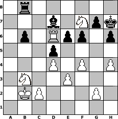 Partie eroeffnet am 15.09.2009, 00:02 Uhr und beendet am 17.10.2009, 08:44 Uhr Spieler weiss: commander Spieler schwarz: Knight commander hat die Partie gewonnen! | |