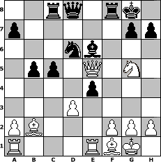 Partie-Notation im PGN-Format [Event "Orang - Utan"] [Site "www.mySchach.de"] [Date "2012.03.06"] [Round "1"] [White "HenrySchinasky"] [Black "Haki"] [ECO "A00"] [WhitemyELO "2107"] [BlackmyELO "1312"] [Result "1-0"] [TimeControl "10/2592000"] [WhiteDays "89"] [BlackDays "90"] [MySchachNr "80330"] 1. b4 e5 2. Bb2 Bxb4 3. Bxe5 Nf6 4. Nc3 Bxc3 5. Bxc3 O-O 6. e3 d5 7. Nf3 Nc6 8. Be2 Ne4 9. Bb2 f6 10. d3 Nd6 11. O-O Ne7 12. Re1 c5 13. c4 Be6 14. cxd5 Nxd5 15. e4 Nf4 16. Bf1 b5 17. Qc1 Rc8 18. Qxf4 f5 19. Ng5 fxe4 20. Qe5 1-0 Stellungs-Notation im FEN-Format 2rq1rk1/p5pp/3nb3/1pp1Q1N1/4p3/3P4/PB3PPP/R3RBK1 - - - 1 20 Geschlagene Figuren Weiss: Geschlagene Figuren Schwarz: Klicken Sie auf eine geschlagene Figur um den gewünschten Zug darzustellen!