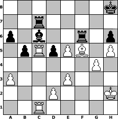 Partie-Notation im PGN-Format [Event "Mal wieder spielen ?"] [Site "www.mySchach.de"] [Date "2012.04.09"] [Round "1"] [White "espero"] [Black "lasker"] [ECO "D00"] [WhitemyELO "1651"] [BlackmyELO "1393"] [Result "1-0"] [TimeControl "10/2592000"] [WhiteDays "97"] [BlackDays "00"] [MySchachNr "81001"] 1. d4 d5 2. Bf4 Nf6 3. e3 e6 4. c4 b6 5. Nc3 a6 6. Nf3 Bb7 7. Qb3 Be7 8. c5 Nbd7 9. cxb6 cxb6 10. Ne5 O-O 11. Bd3 b5 12. a3 Rc8 13. h3 h6 14. O-O Nh5 15. Bh2 Nhf6 16. Rae1 Nxe5 17. Bxe5 Nd7 18. Bb1 Nxe5 19. dxe5 Qc7 20. Qc2 g6 21. f4 Bxa3 22. bxa3 Qxc3 23. Qf2 Qc7 24. h4 Qe7 25. h5 Kg7 26. Qe2 f5 27. exf6+ Qxf6 28. Bxg6 Bc6 29. Qg4 Kh8 30. Qe2 Rg8 31. Rc1 Kg7 32. Rc5 Rc7 33. Rfc1 Rgc8 34. Qg4 Kh8 35. Kh2 e5 36. Qf5 Qxf5 37. Bxf5 Rf8 38. g4 Rf6 39. fxe5 1-0 Stellungs-Notation im FEN-Format 7k/2r5/p1b2r1p/1pRpPB1P/6P1/P3P3/3P3K/2R5 - - - 0 39 Geschlagene Figuren Weiss: Geschlagene Figuren Schwarz: Klicken Sie auf eine geschlagene Figur um den gewünschten Zug darzustellen!