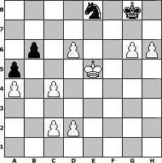 Partie-Notation im PGN-Format [Event "Ende 2014"] [Site "www.mySchach.de"] [Date "2014.12.20"] [Round "1"] [White "Tomino"] [Black "lotchi"] [ECO "D00"] [WhitemyELO "1564"] [BlackmyELO "1201"] [Result "1-0"] [TimeControl "10/2592000"] [WhiteDays "132"] [BlackDays "076"] [MySchachNr "97187"] 1. d4 d5 2. Bf4 Nc6 3. Nf3 Nf6 4. e3 Ne4 5. Nc3 a6 6. Bd3 Nxc3 7. bxc3 Bg4 8. h3 Bxf3 9. Qxf3 e6 10. O-O f6 11. e4 dxe4 12. Qxe4 Qd7 13. Rfe1 O-O-O 14. Qxe6 Qxe6 15. Rxe6 Bd6 16. Bxd6 cxd6 17. Rae1 Rd7 18. f4 Kc7 19. d5 Nd8 20. Re7 g6 21. g4 Rxe7 22. Rxe7+ Kc8 23. Kf2 a5 24. a4 g5 25. Rxh7 Rxh7 26. Bxh7 b6 27. fxg5 fxg5 28. Ke3 Nf7 29. Ke4 Kd7 30. Kf5 Ke7 31. Bg8 Nh6+ 32. Kxg5 Nxg8 33. Kg6 Nf6 34. c4 Ng8 35. g5 Kf8 36. h4 Ne7+ 37. Kf6 Ng8+ 38. Ke6 Ne7 39. h5 Nc8 40. Kd7 Ne7 41. Kxd6 Nf5+ 42. Ke5 Ng7 43. h6 Ne8 44. g6 Kg8 45. d6 1-0 Stellungs-Notation im FEN-Format 4n1k1/8/1p1P2PP/p3K3/P1P5/8/2PP4/8 - - - 0 45 Geschlagene Figuren Weiss: Geschlagene Figuren Schwarz: Klicken Sie auf eine geschlagene Figur um den gewünschten Zug darzustellen!
