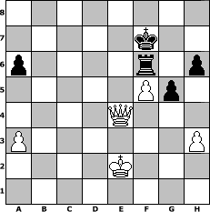 Partie-Notation im PGN-Format [Event "Trainingslager II"] [Site "www.mySchach.de"] [Date "2011.05.24"] [Round "1"] [White "Master1"] [Black "Vahl1"] [ECO "D00"] [WhitemyELO "1331"] [BlackmyELO "1609"] [Result "1-0"] [TimeControl "10/1728000"] [WhiteDays "19"] [BlackDays "13"] [MySchachNr "74104"] 1. d4 d5 2. e3 Nc6 3. Bd3 Nf6 4. Nf3 Bg4 5. Nbd2 e5 6. e4 Bxf3 7. Nxf3 dxe4 8. Nxe5 exd3 9. Nxc6 dxc2 10. Qe2+ Be7 11. Nxd8 Rxd8 12. Qxc2 c6 13. O-O O-O 14. Be3 Nd5 15. Rfe1 Bf6 16. a3 Rfe8 17. Qd3 Re7 18. h3 Nc7 19. Rab1 Ne6 20. b4 a6 21. Qc4 Red7 22. Red1 Bxd4 23. Bxd4 h6 24. Qe2 Nxd4 25. Qg4 Kf8 26. Kf1 Rd5 27. Rd3 b6 28. Rbd1 c5 29. Qe4 f5 30. Qf4 R8d7 31. bxc5 bxc5 32. g4 Kg8 33. gxf5 Rf7 34. Rxd4 cxd4 35. Rxd4 Rfxf5 36. Qb8+ Kh7 37. Rxd5 Rxd5 38. Qb7 Rd6 39. Qb4 Rf6 40. f4 Kg8 41. Qe4 g5 42. f5 Kf7 43. Ke2 1-0 Stellungs-Notation im FEN-Format 8/5k2/p4r1p/5Pp1/4Q3/P6P/4K3/8 - - - 2 43 Geschlagene Figuren Weiss: Geschlagene Figuren Schwarz: Klicken Sie auf eine geschlagene Figur um den gewünschten Zug darzustellen!