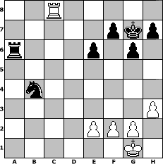 Partie-Notation im PGN-Format [Event "Trainingslager II"] [Site "www.mySchach.de"] [Date "2011.05.24"] [Round "2"] [White "Steppenwolf"] [Black "Duschgel"] [ECO "B15"] [WhitemyELO "1115"] [BlackmyELO "1571"] [Result "0-1"] [TimeControl "10/1728000"] [WhiteDays "06"] [BlackDays "20"] [MySchachNr "74153"] 1. e4 c6 2. d4 d5 3. Nc3 g6 4. Bg5 Bg7 5. Nf3 Bg4 6. h3 Bxf3 7. Qxf3 dxe4 8. Qxe4 Qxd4 9. Bc4 Qxe4+ 10. Nxe4 b5 11. Bb3 Bxb2 12. Rd1 Nd7 13. O-O Ngf6 14. Nxf6+ Bxf6 15. Bxf6 Nxf6 16. c4 O-O 17. cxb5 cxb5 18. Rfe1 e6 19. a4 bxa4 20. Bxa4 Nd5 21. Bc6 Rad8 22. Ra1 Rd6 23. Rec1 Nb4 24. Bb5 a6 25. Bc4 Rc8 26. Bxa6 Rxc1+ 27. Rxc1 Rxa6 28. Rc8+ Kg7 0-1 Stellungs-Notation im FEN-Format 2R5/5pkp/r3p1p1/8/1n6/7P/4PPP1/6K1 - - - 2 29 Geschlagene Figuren Weiss: Geschlagene Figuren Schwarz: Klicken Sie auf eine geschlagene Figur um den gewünschten Zug darzustellen!