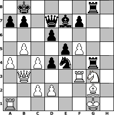 Partie-Notation im PGN-Format [Event "Ostern 2011"] [Site "www.mySchach.de"] [Date "2011.03.18"] [Round "2"] [White "Duschgel"] [Black "HPB2005"] [ECO "A15"] [WhitemyELO "1606"] [BlackmyELO "1968"] [Result "0-1"] [TimeControl "10/2592000"] [WhiteDays "81"] [BlackDays "64"] [MySchachNr "72844"] 1. c4 Nf6 2. g3 c5 3. Bg2 Nc6 4. Nc3 d6 5. e4 e5 6. Nge2 Be7 7. O-O h5 8. f4 Bg4 9. h3 Bxe2 10. Nxe2 h4 11. f5 hxg3 12. Nxg3 Qd7 13. a3 O-O-O 14. b4 g5 15. Qa4 Kb8 16. b5 Nd4 17. Bb2 Rh4 18. Bxd4 cxd4 19. Qb3 g4 20. hxg4 Rxg4 21. a4 Rdg8 22. Rf3 Nxe4 0-1 Stellungs-Notation im FEN-Format 1k4r1/pp1qbp2/3p4/1P2pP2/P1Ppn1r1/1Q3RN1/2PP2B1/R5K1 - - - 0 23 Geschlagene Figuren Weiss: Geschlagene Figuren Schwarz: Klicken Sie auf eine geschlagene Figur um den gewünschten Zug darzustellen!