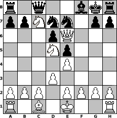Partie-Notation im PGN-Format [Event "mal was andres"] [Site "www.mySchach.de"] [Date "2008.12.19"] [Round "1"] [White "rikilatic"] [Black "MichaelKnopf"] [ECO "C00"] [WhitemyELO "1295"] [BlackmyELO "1186"] [Result "1-0"] [TimeControl "10/2592000"] [WhiteDays "45"] [BlackDays "57"] [MySchachNr "50845"] 1. e4 e6 2. Nc3 e5 3. Bc4 Nf6 4. Nf3 d6 5. Ng5 Be6 6. Bxe6 fxe6 7. Nxe6 Qe7 8. Ng5 Nfd7 9. d3 Nc6 10. Nd5 Qd8 11. Ne6 Qc8 12. Nexc7+ Kf7 13. Qf3+ Kg8 14. Qf5 Ne7 15. Qe6# 1-0 Stellungs-Notation im FEN-Format r1q2bkr/ppNnn1pp/3pQ3/3Np3/4P3/3P4/PPP1PPPP/R1B1K2R - KQ - 6 15 Geschlagene Figuren Weiss: ![]() ![]() ![]() ![]() ![]() ![]() ![]() ![]() ![]() ![]() ![]() ![]() ![]() ![]() ![]() Geschlagene Figuren Schwarz: ![]() ![]() ![]() ![]() ![]() ![]() ![]() ![]() ![]() ![]() ![]() ![]() ![]() ![]() ![]() Klicken Sie auf eine geschlagene Figur um den gewünschten Zug darzustellen!
