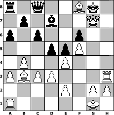 Partie-Notation im PGN-Format [Event "1. Young Gunz Clubturnier"] [Site "www.mySchach.de"] [Date "2005.08.18"] [Round "1"] [White "jlarue700"] [Black "Fuffy"] [ECO "C55"] [WhitemyELO "1561"] [BlackmyELO "1442"] [Result "1-0"] [TimeControl "10/864000"] [WhiteDays "29"] [BlackDays "30"] [MySchachNr "16392"] 1. e4 e5 2. Nf3 Nc6 3. Bc4 Nf6 4. d3 h6 5. O-O Bc5 6. Nc3 O-O 7. a3 d6 8. b4 Bb6 9. Nd5 Nxd5 10. Bxd5 Bd4 11. Nxd4 Nxd4 12. c3 Nb5 13. Bd2 c6 14. Bb3 Nc7 15. Qh5 Bd7 16. f4 Be6 17. Bc2 Qc8 18. f5 Bd7 19. Rf3 f6 20. Bb3+ Kh8 21. Rh3 a6 22. Bxh6 d5 23. Qg6 Ne8 24. Bxg7+ Kg8 25. Bxf8+ Ng7 26. Qxg7# 1-0 Stellungs-Notation im FEN-Format r1q2Bk1/1p1b2Q1/p1p2p2/3ppP2/1P2P3/PBPP3R/4P1PP/R5K1 - - - 0 26 Geschlagene Figuren Weiss: Geschlagene Figuren Schwarz: Klicken Sie auf eine geschlagene Figur um den gewünschten Zug darzustellen!