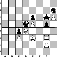 | Partie-Notation im PGN-Format [Event "Abwrackturnier"] [Site "www.mySchach.de"] [Date "2009.04.16"] [Round "1"] [White "neve"] [Black "Andreas"] [ECO "D31"] [WhitemyELO "1557"] [BlackmyELO "1625"] [Result "0-1"] [TimeControl "10/864000"] [WhiteDays "60"] [BlackDays "37"] [MySchachNr "54921"] 1. d4 d5 2. c4 e6 3. Nc3 c6 4. Nf3 g6 5. Bg5 f6 6. Bf4 Nd7 7. h4 Bb4 8. e3 Ne7 9. Bd3 b6 10. Qa4 Bxc3+ 11. bxc3 Bb7 12. Bh6 Kf7 13. Qc2 dxc4 14. Bxc4 b5 15. Be2 Rc8 16. Qd1 Nf5 17. Bf4 Qb6 18. e4 Ne7 19. Be3 c5 20. Qb1 a6 21. Bd3 c4 22. Bc2 Qd8 23. a4 Bc6 24. axb5 axb5 25. h5 Qc7 26. Nd2 Rb8 27. Kf1 g5 28. h6 Ng6 29. Rh3 Nf4 30. Rf3 Ng6 31. Bxg5 Ra8 32. Be3 Rxa1 33. Qxa1 Ra8 34. Qb2 Ra6 35. Rg3 Qb8 36. e5 fxe5 37. Bxg6+ hxg6 38. Qb1 Nf8 39. dxe5 Qa8 40. Ke2 Ra2 41. Bc5 Be4 42. Qxb5 Qd5 43. Ke3 Rxd2 44. Kf4 Rxf2+ 45. Bxf2 Qxb5 46. Kxe4 Qd5+ 47. Kf4 Nh7 48. Bd4 g5+ 49. Ke3 Kg6 0-1 Stellungs-Notation im FEN-Format 8/7n/4p1kP/3qP1p1/2pB4/2P1K1R1/6P1/8 - - - 2 50 Geschlagene Figuren Weiss:                              Geschlagene Figuren Schwarz:                               Klicken Sie auf eine geschlagene Figur um den gewünschten Zug darzustellen!