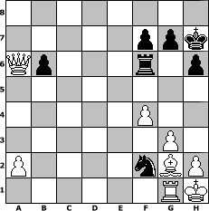 Partie-Notation im PGN-Format [Event "Spanisch?"] [Site "www.mySchach.de"] [Date "2016.09.07"] [Round "1"] [White "freizeitspieler"] [Black "miu"] [ECO "E00"] [WhitemyELO "1618"] [BlackmyELO "1529"] [Result "0-1"] [TimeControl "10/2592000"] [WhiteDays "090"] [BlackDays "115"] [MySchachNr "104822"] 1. d4 Nf6 2. c4 e6 3. g3 d5 4. Nc3 Bb4 5. Bg2 c6 6. Nf3 b6 7. O-O Nbd7 8. Bg5 Bxc3 9. bxc3 h6 10. Bxf6 Nxf6 11. Ne5 Bb7 12. Qa4 Qc7 13. cxd5 exd5 14. c4 O-O 15. Rac1 c5 16. dxc5 Qxe5 17. c6 Bxc6 18. Qxc6 Rfc8 19. Qa4 Qxe2 20. cxd5 Rxc1 21. Rxc1 a6 22. d6 Rd8 23. Qc6 Qd2 24. Rb1 Rxd6 25. Qc8+ Kh7 26. Qxa6 Ng4 27. Rf1 Rf6 28. f4 Qe3+ 29. Kh1 Nf2+ 30. Kg1 Nh3+ 31. Kh1 Qg1+ 32. Rxg1 Nf2# 0-1 Stellungs-Notation im FEN-Format 8/5ppk/Qp3r1p/8/5P2/6P1/P4nBP/6RK - - - 1 33 Geschlagene Figuren Weiss: Geschlagene Figuren Schwarz: Klicken Sie auf eine geschlagene Figur um den gewünschten Zug darzustellen!