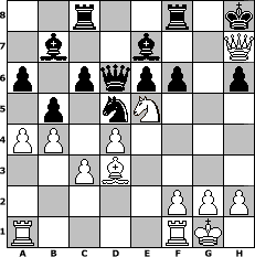 Partie-Notation im PGN-Format [Event "LISA OPEN #1"] [Site "www.mySchach.de"] [Date "2017.09.02"] [Round "1"] [White "Erich"] [Black "Joschi"] [ECO "B17"] [WhitemyELO "2159"] [BlackmyELO "1626"] [Result "1-0"] [TimeControl "10/1728000"] [WhiteDays "20"] [BlackDays "20"] [MySchachNr "109417"] 1. e4 c6 2. d4 d5 3. Nc3 dxe4 4. Nxe4 Nd7 5. c3 Ngf6 6. Nxf6+ Nxf6 7. Bc4 e6 8. Nf3 Be7 9. O-O O-O 10. Qe2 b5 11. Bd3 a6 12. Ne5 Bb7 13. Bg5 Rc8 14. b4 Nd5 15. Bd2 Qd6 16. a4 f6 17. Qh5 h6 18. Bxh6 gxh6 19. Qg6+ Kh8 20. Qh7# 1-0 Stellungs-Notation im FEN-Format 2r2r1k/1b2b2Q/p1pqpp1p/1p1nN3/PP1P4/2PB4/5PPP/R4RK1 - - - 3 20 Geschlagene Figuren Weiss: Geschlagene Figuren Schwarz: Klicken Sie auf eine geschlagene Figur um den gewünschten Zug darzustellen!