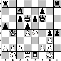 Partie-Notation im PGN-Format [Event "2. Norderstedter DENK MAL Open 2011"] [Site "www.mySchach.de"] [Date "2011.06.02"] [Round "1"] [White "Chaos"] [Black "Joschi"] [ECO "A00"] [WhitemyELO "1856"] [BlackmyELO "1531"] [Result "1-0"] [TimeControl "10/2592000"] [WhiteDays "28"] [BlackDays "30"] [MySchachNr "74320"] 1. Nc3 d5 2. Nf3 Nf6 3. d4 e6 4. Bg5 c5 5. e3 Nc6 6. Be2 cxd4 7. exd4 Be7 8. O-O h6 9. Bh4 g5 10. Bg3 Nh5 11. Bb5 Nxg3 12. hxg3 Bd7 13. Re1 g4 14. Bxc6 Bxc6 15. Ne5 h5 16. Qe2 Bd6 17. Rad1 Qf6 18. Nxc6 bxc6 19. Qa6 Kd7 20. Qb7+ Bc7 21. Na4 h4 22. Nc5+ Kd6 23. Qb4 a5 24. Ne4+ 1-0 Stellungs-Notation im FEN-Format r6r/2b2p2/2pkpq2/p2p4/1Q1PN1pp/6P1/PPP2PP1/1N1RR1K1 - - - 1 24 Geschlagene Figuren Weiss: Geschlagene Figuren Schwarz: Klicken Sie auf eine geschlagene Figur um den gewünschten Zug darzustellen!