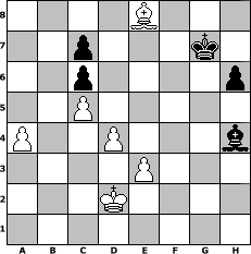 Partie-Notation im PGN-Format [Event "Trainingslager"] [Site "www.mySchach.de"] [Date "2011.05.21"] [Round "1"] [White "Stoertebecker"] [Black "Greenhorn"] [ECO "D00"] [WhitemyELO "1657"] [BlackmyELO "1613"] [Result "1-0"] [TimeControl "10/2592000"] [WhiteDays "052"] [BlackDays "106"] [MySchachNr "74022"] 1. d4 d5 2. h4 Nf6 3. Nc3 e6 4. Bf4 Nc6 5. e3 Be7 6. Nf3 O-O 7. Qd3 Bd7 8. O-O-O a6 9. Bg5 Nb4 10. Qd2 Ne4 11. Nxe4 dxe4 12. Qxb4 Bxb4 13. Bxd8 Raxd8 14. a3 Bd6 15. Nd2 Bc6 16. Nb3 Bd5 17. c4 Bc6 18. Na5 Rb8 19. Nxc6 bxc6 20. c5 Be7 21. Bxa6 f5 22. Kc2 g5 23. hxg5 Bxg5 24. Rh5 h6 25. g3 Kg7 26. Rg1 Kg6 27. Be2 Kh7 28. b3 Rg8 29. a4 f4 30. gxf4 Bf6 31. Rxg8 Rxg8 32. f3 Rg2 33. Kd1 Rg1+ 34. Kd2 Kg6 35. fxe4 Rb1 36. f5+ exf5 37. Rxf5 Rxb3 38. Bh5+ Kg7 39. e5 Bg5 40. e6 Bh4 41. Rf7+ Kg8 42. e7 Rb8 43. Rg7+ Kxg7 44. e8=Q Rxe8 45. Bxe8 1-0 Stellungs-Notation im FEN-Format 4B3/2p3k1/2p4p/2P5/P2P3b/4P3/3K4/8 - - - 0 45 Geschlagene Figuren Weiss: ![]() ![]() ![]() ![]() ![]() ![]() ![]() ![]() ![]() ![]() ![]() ![]() ![]() ![]() ![]() Geschlagene Figuren Schwarz: ![]() ![]() ![]() ![]() ![]() ![]() ![]() ![]() ![]() ![]() ![]() ![]() ![]() ![]() ![]() Klicken Sie auf eine geschlagene Figur um den gewünschten Zug darzustellen!