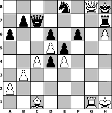 Partie-Notation im PGN-Format [Event "Bremer Schl"] [Site "www.mySchach.de"] [Date "2008.11.01"] [Round "2"] [White "Baehr008"] [Black "martinus"] [ECO "E61"] [WhitemyELO "1996"] [BlackmyELO "1928"] [Result "1-0"] [TimeControl "10/2592000"] [WhiteDays "101"] [BlackDays "090"] [MySchachNr "49444"] 1. d4 Nf6 2. c4 g6 3. Nc3 d6 4. e4 Bg7 5. f4 O-O 6. Nf3 Bg4 7. Be2 Nbd7 8. O-O c5 9. d5 a6 10. Qc2 Nb6 11. Bd3 Bxf3 12. Rxf3 Nbd7 13. Bd2 Qc7 14. b3 Ng4 15. Raf1 Bd4+ 16. Kh1 Rae8 17. h3 Ngf6 18. Ne2 Nh5 19. Nxd4 cxd4 20. Qb2 Qb6 21. g4 Ng7 22. Bc1 e5 23. f5 f6 24. fxg6 hxg6 25. h4 Nc5 26. h5 Nxd3 27. Rxd3 gxh5 28. gxh5 Re7 29. h6 Ne8 30. Qg2+ Kh8 31. Rg3 Qc7 32. Rg1 Rh7 33. Rg8+ Rxg8 34. Qxg8# 1-0 Stellungs-Notation im FEN-Format 4n1Qk/1pq4r/p2p1p1P/3Pp3/2PpP3/1P6/P7/2B3RK - - - 0 34 Geschlagene Figuren Weiss: Geschlagene Figuren Schwarz: Klicken Sie auf eine geschlagene Figur um den gewünschten Zug darzustellen!