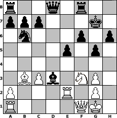 Partie-Notation im PGN-Format [Event "2016 klingt aus"] [Site "www.mySchach.de"] [Date "2016.12.20"] [Round "1"] [White "Knight"] [Black "shan"] [ECO "D01"] [WhitemyELO "1194"] [BlackmyELO "1410"] [Result "0-1"] [TimeControl "10/1728000"] [WhiteDays "20"] [BlackDays "20"] [MySchachNr "106092"] 1. d4 d5 2. Nc3 Nf6 3. e4 dxe4 4. f3 exf3 5. Nxf3 e6 6. Bg5 Bb4 7. Bc4 Bxc3+ 8. bxc3 h6 9. Bh4 g5 10. Bg3 Nc6 11. O-O Ne4 12. Qd3 Nxg3 13. hxg3 O-O 14. Nd2 Kg7 15. Nf3 f6 16. Rfe1 e5 17. d5 Ne7 18. Nd2 Bf5 19. Qf1 Bxc2 20. Nf3 Nxd5 21. Re2 Nb6 22. Bb3 Bd3 0-1 Stellungs-Notation im FEN-Format r2q1r2/ppp3k1/1n3p1p/4p1p1/8/1BPb1NP1/P3R1P1/R4QK1 - - - 4 23 Geschlagene Figuren Weiss: ![]() ![]() ![]() ![]() ![]() ![]() ![]() ![]() ![]() ![]() ![]() ![]() ![]() ![]() ![]() Geschlagene Figuren Schwarz: ![]() ![]() ![]() ![]() ![]() ![]() ![]() ![]() ![]() ![]() ![]() ![]() ![]() ![]() ![]() Klicken Sie auf eine geschlagene Figur um den gewünschten Zug darzustellen!