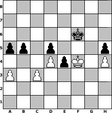 Partie-Notation im PGN-Format [Event "Karnevalsstress"] [Site "www.mySchach.de"] [Date "2009.02.15"] [Round "1"] [White "martinus"] [Black "kischok46"] [ECO "E21"] [WhitemyELO "1877"] [BlackmyELO "2031"] [Result "0-1"] [TimeControl "10/1728000"] [WhiteDays "107"] [BlackDays "120"] [MySchachNr "52786"] 1. d4 Nf6 2. c4 e6 3. Nc3 Bb4 4. Nf3 Ne4 5. Qd3 d5 6. g3 O-O 7. Bg2 b6 8. O-O Bxc3 9. bxc3 Ba6 10. Ne5 Nd6 11. Ba3 c5 12. dxc5 Nxc4 13. Nxc4 Bxc4 14. Qe3 b5 15. Rfd1 Qa5 16. Bb4 Qa4 17. c6 Rc8 18. c7 Na6 19. Bd6 Nxc7 20. a3 Ne8 21. Be5 Rc6 22. Rd2 f6 23. Bd4 e5 24. Bc5 Nc7 25. f4 e4 26. f5 Ne8 27. Bd4 Nd6 28. g4 Bb3 29. Qf4 Rf8 30. e3 Nf7 31. h4 h6 32. Bf1 a6 33. Rg2 Qa5 34. Qg3 Bc4 35. Bxc4 Rxc4 36. Rb2 Rfc8 37. Rb4 Qd8 38. Rxc4 Rxc4 39. Rb1 Kh7 40. Rb4 Qc8 41. Qe1 Kg8 42. Qa1 h5 43. Rxc4 Qxc4 44. g5 Qe2 45. gxf6 Nh6 46. Qf1 Qg4+ 47. Qg2 Qxg2+ 48. Kxg2 Nxf5 49. fxg7 Nxd4 50. exd4 Kxg7 51. Kg3 a5 52. Kf4 Kf6 0-1 Stellungs-Notation im FEN-Format 8/8/5k2/pp1p3p/3PpK1P/P1P5/8/8 - - - 2 53 Geschlagene Figuren Weiss: Geschlagene Figuren Schwarz: Klicken Sie auf eine geschlagene Figur um den gewünschten Zug darzustellen!