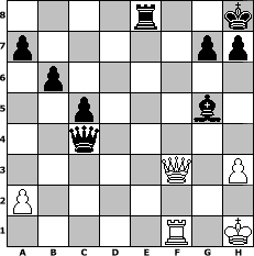 Partie-Notation im PGN-Format [Event "Ab in den Herbst"] [Site "www.mySchach.de"] [Date "2014.09.23"] [Round "1"] [White "muellerh"] [Black "FrankB"] [ECO "A13"] [WhitemyELO "1498"] [BlackmyELO "1730"] [Result "0-1"] [TimeControl "10/864000"] [WhiteDays "07"] [BlackDays "09"] [MySchachNr "96044"] 1. c4 e6 2. Nc3 Nf6 3. d4 b6 4. Nf3 Bb7 5. Bg5 Be7 6. Bxf6 Bxf6 7. e4 d6 8. Be2 Nd7 9. O-O O-O 10. Qc2 c5 11. e5 dxe5 12. dxe5 Nxe5 13. Nxe5 Bxe5 14. Rad1 Qg5 15. Ne4 Bxe4 16. Qxe4 Bxb2 17. f4 Qf6 18. f5 Bd4+ 19. Kh1 Rfe8 20. fxe6 Qxe6 21. Qf3 Qxe2 22. Qxf7+ Kh8 23. h3 Qe7 24. Qf3 Bf6 25. Rde1 Qf7 26. Rxe8+ Rxe8 27. g4 Qxc4 28. g5 Bxg5 0-1 Stellungs-Notation im FEN-Format 4r2k/p5pp/1p6/2p3b1/2q5/5Q1P/P7/5R1K - - - 0 29 Geschlagene Figuren Weiss: ![]() ![]() ![]() ![]() ![]() ![]() ![]() ![]() ![]() ![]() ![]() ![]() ![]() ![]() ![]() Geschlagene Figuren Schwarz: ![]() ![]() ![]() ![]() ![]() ![]() ![]() ![]() ![]() ![]() ![]() ![]() ![]() ![]() ![]() Klicken Sie auf eine geschlagene Figur um den gewünschten Zug darzustellen!