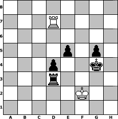 Partie-Notation im PGN-Format [Event "Winter 19/20"] [Site "www.mySchach.de"] [Date "2020.01.09"] [Round "2"] [White "lotchi"] [Black "Joschi"] [ECO "A48"] [WhitemyELO "1308"] [BlackmyELO "1598"] [Result "0-1"] [TimeControl "10/2592000"] [WhiteDays "172"] [BlackDays "180"] [MySchachNr "116916"] 1. d4 Nf6 2. Nf3 g6 3. Nc3 d5 4. Bg5 Bg7 5. e3 e6 6. Ne5 O-O 7. Bd3 Nbd7 8. Nxd7 Bxd7 9. O-O a6 10. a4 Rc8 11. Bxf6 Bxf6 12. g3 c5 13. f4 cxd4 14. exd4 Bxd4+ 15. Kh1 Bxc3 16. bxc3 Rxc3 17. Qd2 Qc7 18. Qe3 Bc6 19. Qd4 Bd7 20. Rfb1 b5 21. axb5 Bxb5 22. Kg2 Bxd3 23. cxd3 Rc2+ 24. Kh3 Qd7 25. g4 h5 26. Rxa6 hxg4+ 27. Kg3 Rfc8 28. Ra7 R2c7 29. Rxc7 Qxc7 30. Kxg4 Qc2 31. Rb2 Qc3 32. Qxc3 Rxc3 33. Rd2 Kg7 34. Rd1 Kf6 35. h4 Ra3 36. Kf3 Kf5 37. Kg3 f6 38. Kf3 e5 39. fxe5 fxe5 40. Ke2 Kg4 41. Rg1+ Kh5 42. Rh1 Ra2+ 43. Ke3 Ra4 44. Rc1 Rxh4 45. Rc5 d4+ 46. Kf2 Rh2+ 47. Kg3 Re2 48. Rd5 Re3+ 49. Kf2 Kg4 50. Rd6 g5 51. Rd7 Rxd3 0-1 Stellungs-Notation im FEN-Format 8/3R4/8/4p1p1/3p2k1/3r4/5K2/8 - - - 0 52 Geschlagene Figuren Weiss: Geschlagene Figuren Schwarz: Klicken Sie auf eine geschlagene Figur um den gewünschten Zug darzustellen!