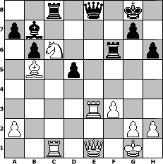Partie-Notation im PGN-Format [Event "33 1/3"] [Site "www.mySchach.de"] [Date "2009.06.02"] [Round "1"] [White "bruno"] [Black "werderfan"] [ECO "D31"] [WhitemyELO "1725"] [BlackmyELO "1534"] [Result "1-0"] [TimeControl "10/864000"] [WhiteDays "10"] [BlackDays "10"] [MySchachNr "56259"] 1. d4 d5 2. c4 e6 3. Nc3 Bb4 4. Bd2 Bxc3 5. Bxc3 Nf6 6. Nf3 O-O 7. e3 dxc4 8. Bxc4 Nc6 9. O-O Ne4 10. Bd3 Nxc3 11. bxc3 h6 12. Re1 Bd7 13. Rb1 Rb8 14. e4 Re8 15. e5 f6 16. Qb3 Na5 17. Qa3 b6 18. c4 Bc6 19. Re3 Rf8 20. c5 Kh8 21. exf6 Rxf6 22. Ne5 Bb7 23. Qc3 Kg8 24. cxb6 cxb6 25. f3 Qc8 26. Qe1 Nc6 27. Rc1 Qe8 28. Bb5 Rc8 29. d5 exd5 30. Nxc6 1-0 Stellungs-Notation im FEN-Format 2r1q1k1/pb4p1/1pN2r1p/1B1p4/8/4RP2/P5PP/2R1Q1K1 - - - 0 30 Geschlagene Figuren Weiss: ![]() ![]() ![]() ![]() ![]() ![]() ![]() ![]() ![]() ![]() ![]() ![]() ![]() ![]() ![]() Geschlagene Figuren Schwarz: ![]() ![]() ![]() ![]() ![]() ![]() ![]() ![]() ![]() ![]() ![]() ![]() ![]() ![]() ![]() Klicken Sie auf eine geschlagene Figur um den gewünschten Zug darzustellen!