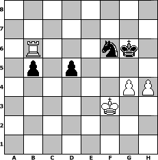 Partie-Notation im PGN-Format [Event "unter uns Nr. 37 (Advendturnier)"] [Site "www.mySchach.de"] [Date "2016.11.25"] [Round "1"] [White "borsti"] [Black "Haneken"] [ECO "C41"] [WhitemyELO "1231"] [BlackmyELO "1098"] [Result "1-0"] [TimeControl "10/864000"] [WhiteDays "50"] [BlackDays "49"] [MySchachNr "105841"] 1. e4 e5 2. Nf3 d6 3. Bc4 Be6 4. Bxe6 fxe6 5. d3 c5 6. Nc3 Qa5 7. O-O Qd8 8. Bg5 Be7 9. Bxe7 Qxe7 10. Qd2 Nf6 11. a4 O-O 12. a5 Ng4 13. h3 Nh6 14. Ra4 Qf6 15. b4 a6 16. Raa1 cxb4 17. Na4 Nc6 18. Nb2 Rab8 19. Nc4 Rbd8 20. Nb6 g6 21. Qxh6 g5 22. Qxg5+ Qxg5 23. Nxg5 Nd4 24. Rfc1 Ne2+ 25. Kf1 Nxc1 26. Nxe6 Nxd3 27. Nxf8 Rxf8 28. f3 Nf4 29. Rb1 Rf6 30. Kf2 Rg6 31. Rg1 h6 32. h4 Ne6 33. Nc8 Nd4 34. Rc1 h5 35. c3 Nb3 36. Rb1 Nxa5 37. Rxb4 b5 38. Ne7+ Kf7 39. Nxg6 Kxg6 40. Rb1 Nc4 41. g4 hxg4 42. fxg4 Nd2 43. Ra1 Nxe4+ 44. Kf3 Nxc3 45. Rxa6 e4+ 46. Ke3 Nd5+ 47. Kxe4 Nf6+ 48. Kf3 d5 49. Rb6 1-0 Stellungs-Notation im FEN-Format 8/8/1R3nk1/1p1p4/6PP/5K2/8/8 - - - 1 49 Geschlagene Figuren Weiss: Geschlagene Figuren Schwarz: Klicken Sie auf eine geschlagene Figur um den gewünschten Zug darzustellen!