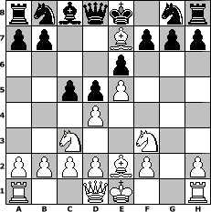 Partie-Notation im PGN-Format [Event "Wrixum - Open die III."] [Site "www.mySchach.de"] [Date "2006.10.24"] [Round "1"] [White "Knight"] [Black "romain63"] [ECO "A45"] [WhitemyELO "1364"] [BlackmyELO "1648"] [Result "1-0"] [TimeControl "10/3456000"] [WhiteDays "36"] [BlackDays "00"] [MySchachNr "29472"] 1. d4 Nf6 2. g4 Nxg4 3. e4 d5 4. Be2 Nf6 5. e5 Ng8 6. Nc3 e6 7. Nf3 c5 8. Bg5 Be7 9. Bxe7 1-0 Stellungs-Notation im FEN-Format rnbqk1nr/pp2Bppp/4p3/2ppP3/3P4/2N2N2/PPPPBP1P/R2QK2R - KQkq - 0 9 Geschlagene Figuren Weiss: ![]() ![]() ![]() ![]() ![]() ![]() ![]() ![]() ![]() ![]() ![]() ![]() ![]() ![]() ![]() Geschlagene Figuren Schwarz: ![]() ![]() ![]() ![]() ![]() ![]() ![]() ![]() ![]() ![]() ![]() ![]() ![]() ![]() ![]() Klicken Sie auf eine geschlagene Figur um den gewünschten Zug darzustellen!