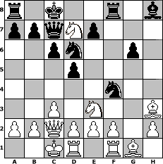Partie-Notation im PGN-Format [Event "3. Chess960/1"] [Site "www.mySchach.de"] [Date "2009.04.06"] [Round "1"] [White "rtu"] [Black "cebulon@"] [Variant "Fischerrandom"] [SetUp "1"] [FEN "rqknnrbb/pppppppp/8/8/8/8/PPPPPPPP/RQKNNRBB w KQkq - 0 1"] [WhitemyELO "1520"] [BlackmyELO "1500"] [Result "1-0"] [TimeControl "10/3456000"] [WhiteDays "34"] [BlackDays "85"] [MySchachNr "54653"] 1. f4 f5 2. c3 g6 3. Ne3 d5 4. g4 c6 5. gxf5 Bf7 6. Qc2 Nd6 7. fxg6 hxg6 8. Nd3 Be8 9. O-O-O Ne6 10. Bg2 Qc7 11. Bh3 Bd7 12. Ne5 Nxf4 13. Nxd7 1-0 Stellungs-Notation im FEN-Format r1k2r1b/ppqNp3/2pn2p1/3p4/5n2/2P1N2B/PPQPPP1P/2KR1RB1 - kq - 0 13 Geschlagene Figuren Weiss: ![]() ![]() ![]() ![]() ![]() ![]() ![]() ![]() ![]() ![]() ![]() ![]() ![]() ![]() ![]() Geschlagene Figuren Schwarz: ![]() ![]() ![]() ![]() ![]() ![]() ![]() ![]() ![]() ![]() ![]() ![]() ![]() ![]() ![]() Klicken Sie auf eine geschlagene Figur um den gewünschten Zug darzustellen!