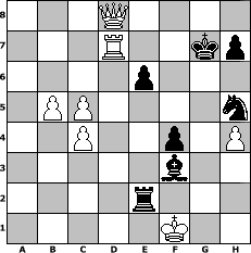 Partie-Notation im PGN-Format [Event "Schach bei einem Schoppen Wein"] [Site "www.mySchach.de"] [Date "2012.02.06"] [Round "1"] [White "Grubengeist"] [Black "espero"] [ECO "B06"] [WhitemyELO "1853"] [BlackmyELO "1739"] [Result "1-0"] [TimeControl "10/1728000"] [WhiteDays "19"] [BlackDays "20"] [MySchachNr "79744"] 1. e4 g6 2. d4 Bg7 3. Nc3 c5 4. dxc5 Na6 5. Bxa6 bxa6 6. Nge2 Bb7 7. Be3 Nf6 8. f3 O-O 9. O-O Nh5 10. Qd2 f5 11. exf5 gxf5 12. Bh6 e6 13. Rad1 Rf7 14. Bxg7 Rxg7 15. b4 a5 16. a3 axb4 17. axb4 a5 18. b5 Qe7 19. Na4 Qh4 20. Nb6 f4 21. Nxa8 Bxa8 22. Qxa5 Bd5 23. c4 Qg5 24. Rf2 Bxf3 25. h4 Qxg2+ 26. Rxg2 Rxg2+ 27. Kf1 Rxe2 28. Qd8+ Kg7 29. Rxd7+ 1-0 Stellungs-Notation im FEN-Format 3Q4/3R2kp/4p3/1PP4n/2P2p1P/5b2/4r3/5K2 - - - 0 29 Geschlagene Figuren Weiss: ![]() ![]() ![]() ![]() ![]() ![]() ![]() ![]() ![]() ![]() ![]() ![]() ![]() ![]() ![]() Geschlagene Figuren Schwarz: ![]() ![]() ![]() ![]() ![]() ![]() ![]() ![]() ![]() ![]() ![]() ![]() ![]() ![]() ![]() Klicken Sie auf eine geschlagene Figur um den gewünschten Zug darzustellen!