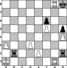 Partie-Notation im PGN-Format [Event "101 Geburtstag von Miguel Najdorf"] [Site "www.mySchach.de"] [Date "2011.04.15"] [Round "1"] [White "lotchi"] [Black "Knight"] [ECO "C48"] [WhitemyELO "1431"] [BlackmyELO "1178"] [Result "1-0"] [TimeControl "10/1728000"] [WhiteDays "79"] [BlackDays "80"] [MySchachNr "73294"] 1. e4 e5 2. Nf3 Nc6 3. Nc3 Nf6 4. Bb5 d6 5. d3 Bd7 6. Bg5 Be7 7. h4 h6 8. Bxf6 Bxf6 9. Bxc6 Bxc6 10. Qd2 O-O 11. O-O-O a5 12. Nd5 b5 13. Nxf6+ Qxf6 14. Qc3 Ra6 15. Kb1 b4 16. Qd2 d5 17. exd5 Bxd5 18. Rde1 Bxf3 19. gxf3 Qxf3 20. Rhg1 c5 21. Qe3 Qxe3 22. Rxe3 Re8 23. f3 a4 24. a3 bxa3 25. bxa3 h5 26. f4 Rae6 27. f5 Rb6+ 28. Ka2 Rc8 29. Rxe5 c4 30. Re4 cxd3 31. cxd3 Rc2+ 32. Ka1 Rbb2 33. Rxa4 Rh2 34. Ra8+ Kh7 35. Ra7 f6 36. Raxg7+ Kh8 37. Rg8+ 1-0 Stellungs-Notation im FEN-Format 6Rk/8/5p2/5P1p/7P/P2P4/1r2P2r/K5R1 - - - 2 37 Geschlagene Figuren Weiss: Geschlagene Figuren Schwarz: Klicken Sie auf eine geschlagene Figur um den gewünschten Zug darzustellen!