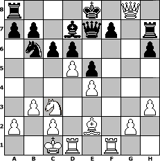 Partie-Notation im PGN-Format [Event "Hobbyschach 2006"] [Site "www.mySchach.de"] [Date "2006.06.16"] [Round "1"] [White "Stoertebecker"] [Black "Rickado"] [ECO "B07"] [WhitemyELO "1659"] [BlackmyELO "1474"] [Result "1-0"] [TimeControl "10/1728000"] [WhiteDays "13"] [BlackDays "33"] [MySchachNr "26200"] 1. e4 d6 2. d4 e6 3. Nf3 Nd7 4. Nc3 c6 5. Bf4 Be7 6. Be2 Nh6 7. Bxh6 gxh6 8. Qd2 Bg5 9. Nxg5 hxg5 10. O-O-O h6 11. h3 Nb6 12. b3 Qc7 13. f4 gxf4 14. Qxf4 Qe7 15. Rhf1 Rh7 16. d5 e5 17. Qg3 Bd7 18. Qg8+ 1-0 Stellungs-Notation im FEN-Format r3k1Q1/pp1bqp1r/1npp3p/3Pp3/4P3/1PN4P/P1P1B1P1/2KR1R2 - q - 3 18 Geschlagene Figuren Weiss: Geschlagene Figuren Schwarz: Klicken Sie auf eine geschlagene Figur um den gewünschten Zug darzustellen!