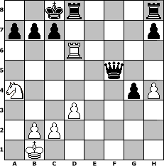Partie-Notation im PGN-Format [Event "Vorweihnachtsfreuden"] [Site "www.mySchach.de"] [Date "2006.11.25"] [Round "1"] [White "crca108"] [Black "Jolilein"] [ECO "B01"] [WhitemyELO "1384"] [BlackmyELO "1333"] [Result "0-1"] [TimeControl "10/1728000"] [WhiteDays "20"] [BlackDays "20"] [MySchachNr "30424"] 1. e4 d5 2. exd5 Qxd5 3. Nc3 Qe6+ 4. Nge2 Nf6 5. d3 Bd7 6. Bf4 Na6 7. Qd2 Nb4 8. a3 Nbd5 9. O-O-O O-O-O 10. g3 Nxf4 11. Nxf4 Qb6 12. Bg2 e6 13. Rhe1 g5 14. Nfe2 Ng4 15. Ne4 Bc6 16. h3 Bxe4 17. Bxe4 Nxf2 18. Nc3 Nxd1 19. Qxd1 f5 20. Bh1 Bh6 21. Kb1 Bf8 22. Qh5 Bxa3 23. Na4 Qf2 24. Rxe6 Bd6 25. Bf3 Qxg3 26. h4 g4 27. Qxf5 Qxf3 28. Rxd6+ Qxf5 0-1 Stellungs-Notation im FEN-Format 2kr3r/ppp4p/3R4/5q2/N5pP/3P4/1PP5/1K6 - - - 0 29 Geschlagene Figuren Weiss: ![]() ![]() ![]() ![]() ![]() ![]() ![]() ![]() ![]() ![]() ![]() ![]() ![]() ![]() ![]() Geschlagene Figuren Schwarz: ![]() ![]() ![]() ![]() ![]() ![]() ![]() ![]() ![]() ![]() ![]() ![]() ![]() ![]() ![]() Klicken Sie auf eine geschlagene Figur um den gewünschten Zug darzustellen!