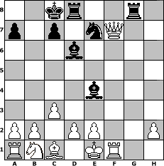 Partie-Notation im PGN-Format [Event "1. Chess Cafe Meisterschaft 2017"] [Site "www.mySchach.de"] [Date "2017.01.01"] [Round "1"] [White "mudb"] [Black "noma"] [ECO "C44"] [WhitemyELO "1111"] [BlackmyELO "1600"] [Result "1-0"] [TimeControl "10/3456000"] [WhiteDays "36"] [BlackDays "36"] [MySchachNr "106253"] 1. e4 e5 2. Nf3 Nc6 3. c3 d5 4. Bb5 dxe4 5. Bxc6+ bxc6 6. Nxe5 Bd6 7. Nxc6 Qd7 8. Qa4 Ne7 9. Qxe4 Bb7 10. Qd4 Qxc6 11. Qxg7 Rg8 12. Qxh7 Qxg2 13. Rf1 Be4 14. Qh4 Qxf2+ 15. Qxf2 O-O-O 16. Qxf7 1-0 Stellungs-Notation im FEN-Format 2kr2r1/p1p1nQ2/3b4/8/4b3/2P5/PP1PP2P/RNB1KR2 - Q - 0 16 Geschlagene Figuren Weiss: Geschlagene Figuren Schwarz: Klicken Sie auf eine geschlagene Figur um den gewünschten Zug darzustellen!