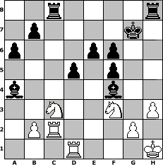 Partie-Notation im PGN-Format [Event "Ihr kinderlein kommet"] [Site "www.mySchach.de"] [Date "2012.12.08"] [Round "1"] [White "rux"] [Black "kalle"] [ECO "B41"] [WhitemyELO "1508"] [BlackmyELO "1547"] [Result "0-1"] [TimeControl "10/2592000"] [WhiteDays "114"] [BlackDays "075"] [MySchachNr "85391"] 1. e4 c5 2. Nf3 e6 3. d4 cxd4 4. Nxd4 Nf6 5. Nc3 d6 6. Be2 a6 7. O-O Be7 8. f4 O-O 9. f5 d5 10. e5 Ne8 11. f6 Bc5 12. Kh1 Nd7 13. fxg7 Nxg7 14. Bh5 Nxe5 15. Bf4 Ng6 16. Bxg6 hxg6 17. Bh6 Qh4 18. Bxg7 Kxg7 19. Nf3 Qh5 20. Re1 Rh8 21. h3 f6 22. Nh2 Qh4 23. Qg4 Qf2 24. Qf3 Qxc2 25. Re2 Qf5 26. Qxf5 gxf5 27. Nf3 Bd7 28. Rc1 Bd6 29. a4 Rac8 30. Rec2 Bf4 31. Rd1 Bxa4 0-1 Stellungs-Notation im FEN-Format 2r4r/1p4k1/p3pp2/3p1p2/b4b2/2N2N1P/1PR3P1/3R3K - - - 0 32 Geschlagene Figuren Weiss: Geschlagene Figuren Schwarz: Klicken Sie auf eine geschlagene Figur um den gewünschten Zug darzustellen!