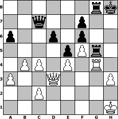 Partie-Notation im PGN-Format [Event "EU Weihnachts-Gipfel Spiele"] [Site "www.mySchach.de"] [Date "2011.12.25"] [Round "1"] [White "Vahl1"] [Black "morchel"] [ECO "A22"] [WhitemyELO "1586"] [BlackmyELO "1442"] [Result "0-1"] [TimeControl "10/1728000"] [WhiteDays "62"] [BlackDays "79"] [MySchachNr "78585"] 1. c4 e5 2. Nc3 Nf6 3. Nf3 Nc6 4. g3 Bc5 5. Bg2 O-O 6. O-O d6 7. d3 Be6 8. a3 a6 9. e4 Qd7 10. Bg5 Bh3 11. Bxf6 gxf6 12. Nd5 Kg7 13. Nxc7 Bxg2 14. Kxg2 Qxc7 15. Nh4 Ne7 16. Qg4+ Kh8 17. f4 Rg8 18. Qh5 Ng6 19. Kh1 b5 20. f5 Ne7 21. Nf3 Nc6 22. b4 Bb6 23. Qh6 Qe7 24. Rg1 Bxg1 25. Rxg1 bxc4 26. dxc4 Rg4 27. Qe3 Nd4 28. h3 Nxf3 29. Qxf3 Rg7 30. Qd3 Qc7 31. Rc1 Rag8 32. g4 h5 33. Rg1 hxg4 34. Rxg4 Rg5 0-1 Stellungs-Notation im FEN-Format 6rk/2q2p2/p2p1p2/4pPr1/1PP1P1R1/P2Q3P/2P5/7K - - - 1 35 Geschlagene Figuren Weiss: Geschlagene Figuren Schwarz: Klicken Sie auf eine geschlagene Figur um den gewünschten Zug darzustellen!