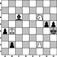 Partie-Notation im PGN-Format [Event "Mittelfeldgepl"] [Site "www.mySchach.de"] [Date "2008.06.26"] [Round "1"] [White "Tommy6"] [Black "thw"] [ECO "C01"] [WhitemyELO "1468"] [BlackmyELO "1501"] [Result "0-1"] [TimeControl "10/1728000"] [WhiteDays "20"] [BlackDays "20"] [MySchachNr "45772"] 1. e4 e6 2. d4 d5 3. exd5 exd5 4. Nf3 Nf6 5. Be2 Bd6 6. h3 h6 7. O-O O-O 8. c3 c6 9. Re1 Re8 10. Bd3 Qc7 11. Rxe8+ Nxe8 12. Qe2 Nf6 13. Be3 Be6 14. Qd2 Nbd7 15. Qc2 Re8 16. Nbd2 b5 17. Re1 a5 18. a3 Nf8 19. a4 b4 20. c4 dxc4 21. Bxc4 Ng6 22. b3 Bd5 23. Bd3 Nf4 24. Kf1 Qd7 25. Bf5 Qc7 26. Rc1 Qe7 27. Re1 Qc7 28. Bxf4 Rxe1+ 29. Nxe1 Bxf4 30. Nef3 Bxd2 31. Nxd2 Qh2 32. Be4 Nxe4 33. Nxe4 f5 34. Ng3 Qxg2+ 35. Ke2 Qf3+ 36. Kf1 Qxb3 37. Qxb3 Bxb3 38. Nxf5 Bxa4 39. Ke2 Bb5+ 40. Kd2 b3 41. Kc3 a4 42. Kb2 Kf7 43. d5 Kf6 44. Ne3 cxd5 45. Nxd5+ Ke5 46. Nc3 Bd7 47. h4 Kf4 48. Nd1 Kg4 49. Ne3+ Kxh4 50. Nd5 g5 51. Nf6 Bc6 52. Kc3 h5 53. Kb4 b2 0-1 Stellungs-Notation im FEN-Format 8/8/2b2N2/6pp/pK5k/8/1p3P2/8 - - - 0 54 Geschlagene Figuren Weiss: Geschlagene Figuren Schwarz: Klicken Sie auf eine geschlagene Figur um den gewünschten Zug darzustellen!