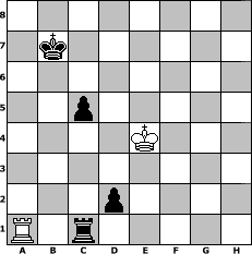 Partie-Notation im PGN-Format [Event "unter uns Nr. 15, Weihnachtsturnier"] [Site "www.mySchach.de"] [Date "2013.12.24"] [Round "1"] [White "beowulf"] [Black "reisender"] [ECO "A10"] [WhitemyELO "1397"] [BlackmyELO "1390"] [Result "0-1"] [TimeControl "10/864000"] [WhiteDays "68"] [BlackDays "68"] [MySchachNr "91793"] 1. c4 g6 2. d4 Bg7 3. Nf3 b6 4. e4 Bb7 5. Nc3 e6 6. Bg5 Bf6 7. Bxf6 Qxf6 8. d5 exd5 9. cxd5 d6 10. Qd4 Nd7 11. Qxf6 Ndxf6 12. O-O-O O-O-O 13. Nd4 Re8 14. f3 Nd7 15. Bb5 f5 16. exf5 Ne7 17. Ne6 Nxf5 18. Kb1 Ne3 19. Rd3 Nxd5 20. Nxd5 Bxd5 21. Rxd5 Rxe6 22. Rd2 Rhe8 23. Rc1 Re1 24. Rdc2 Rxc1+ 25. Rxc1 Re5 26. Bd3 Nc5 27. Bf1 Kb7 28. Kc2 h6 29. Bd3 Re3 30. Bxg6 Re2+ 31. Kb1 Rxg2 32. Be4+ Nxe4 33. fxe4 Rxh2 34. Re1 Rf2 35. Rh1 Rf6 36. Kc2 c5 37. a3 Kc6 38. Kd3 Rf3+ 39. Kd2 Rf4 40. Rxh6 Rxe4 41. Rh7 a5 42. Rh8 Rd4+ 43. Kc3 d5 44. Rh6+ Kb5 45. b3 a4 46. bxa4+ Kxa4 47. Rxb6 Kxa3 48. Ra6+ Ra4 49. Rc6 d4+ 50. Kd3 Ra5 51. Rc7 Kb4 52. Rb7+ Rb5 53. Rc7 Ra5 54. Rb7+ Rb5 55. Rc7 Ka5 56. Ra7+ Kb6 57. Ra4 Rb4 58. Ra8 Kb7 59. Ra5 Rb3+ 60. Kc4 Rc3+ 61. Kd5 d3 62. Ke4 d2 63. Ra1 Rc1 0-1 Stellungs-Notation im FEN-Format 8/1k6/8/2p5/4K3/8/3p4/R1r5 - - - 2 64 Geschlagene Figuren Weiss: Geschlagene Figuren Schwarz: Klicken Sie auf eine geschlagene Figur um den gewünschten Zug darzustellen!